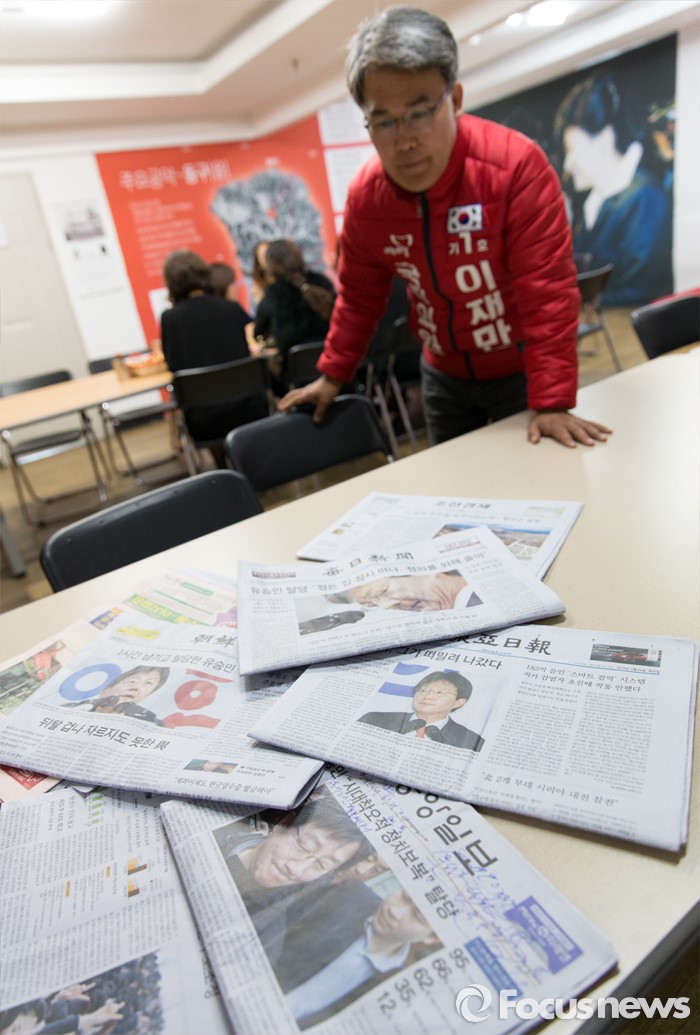 (대구=포커스뉴스) 이재만 예비후보(대구 동구을)가 24일 오후 대구 동구 방촌동의 선거사무소에서 전날 탈당과 함께 무소속 출마를 선언한 유승민 의원의 사진이 실린 신문들을 살펴보고 있다.