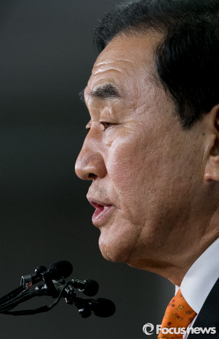 (서울=포커스뉴스) 새누리당을 탈당한 이재오 의원이 24일 오후 서울 여의도 국회 정론관에서 20대 총선 무소속 출마 기자회견을 하고 있다.