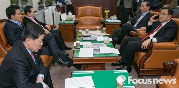 (서울=포커스뉴스) 24일 오후 서울 여의도 국회 새누리당 원내대표실에서 긴급 소집된 최고위원회 간담회를 마친 최고위원들이 자리에 앉아 있다. 앞줄 왼쪽 시계방향으로 황진하 사무총장, 김태호, 이인제, 서청원 최고위원, 김정훈 정책위의장.