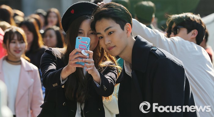 (서울=포커스뉴스) 24일 오후 서울 중구 동대문 디자인 플라자에서 열린 '2016 F/W 헤라 서울패션위크에 참여한 한 모델이 시민들과 사진을 찍고 있다.