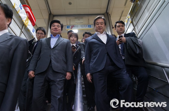 | △ 자갈치시장 회동 마친 김무성과 원유철 |