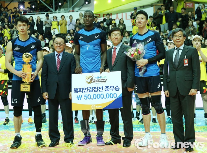 (안산=포커스뉴스) 24일 안산상록수체육관에서 열린 2015-2016 V-리그 남자부 챔피언결정전에서 준우승한 현대캐피탈 문성민, 오레올, 신영석이 시상식에서 구자준 총재 및 관계자들과 기념사진을 찍고 있다.