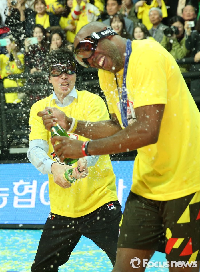 (안산=포커스뉴스) 24일 안산상록수체육관에서 열린 2015-2016 V-리그 남자부 챔피언결정전에서 현대캐피탈을 3승1패로 물리치고 2연패를 달성한 OK저축은행 김세진 감독이 시몬에게 샴페인을 뿌리고 있다.