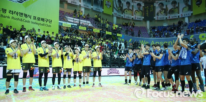 (안산=포커스뉴스) 24일 안산상록수체육관에서 열린 2015-2016 V-리그 남자부 챔피언결정전 4차전에서 패하며 준우승한 현대캐피탈 선수들이 우승한 OK저축은행을 축하해주는 박수를 치고 있다.
