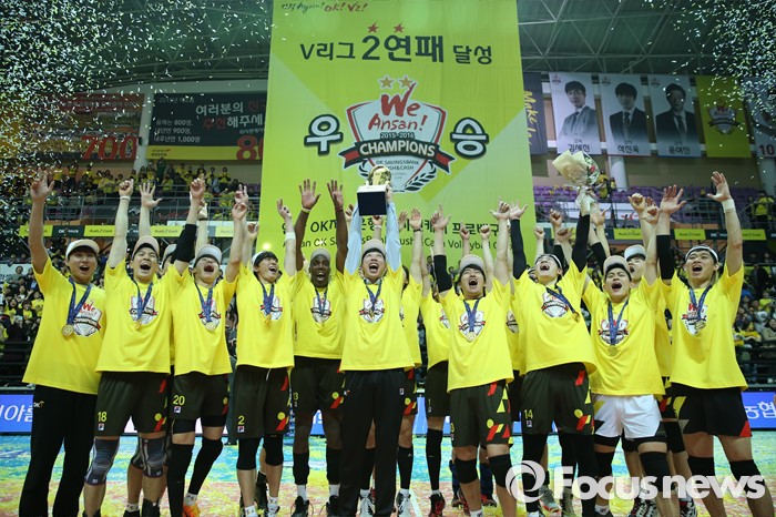 (안산=포커스뉴스) 24일 안산상록수체육관에서 열린 2015-2016 V-리그 남자부 챔피언결정전에서 현대캐피탈을 3승1패로 물리치고 2연패를 달성한 OK저축은행 김세진 감독을 비롯한 선수들이 우승 트로피를 높이 들고 환호하고 있다.