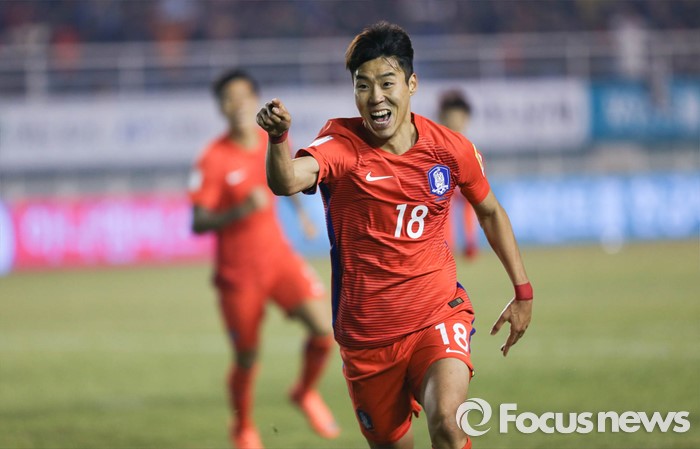 (안산=포커스뉴스) 24일 오후 경기도 안산 와스타디움에서 열린 2018 러시아 월드컵 아시아 2차 예선 7차전 대한민국 대 레바논 경기에서 후반 인저리 타임에 골을 넣은 이정협 선수가 골세레모니를 하고 있다.