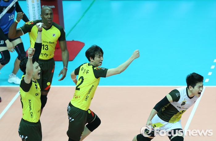 (안산=포커스뉴스) 24일 안산상록수체육관에서 열린 2015-2016 V-리그 남자부 챔피언결정전 4차전에서 OK저축은행이 현대캐피탈을 물리치고 3승1패로 2연패를 달성했다. 경기를 끝내면서 선수들이 환호하고 있다.