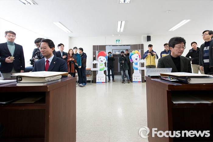 (대구=포커스뉴스) 25일 오전 대구 동구선거관리위원회에서 유승민(오른쪽, 대구 동을) 의원과 류성걸(대구 동갑) 의원이 후보자 등록을 하고 있다.