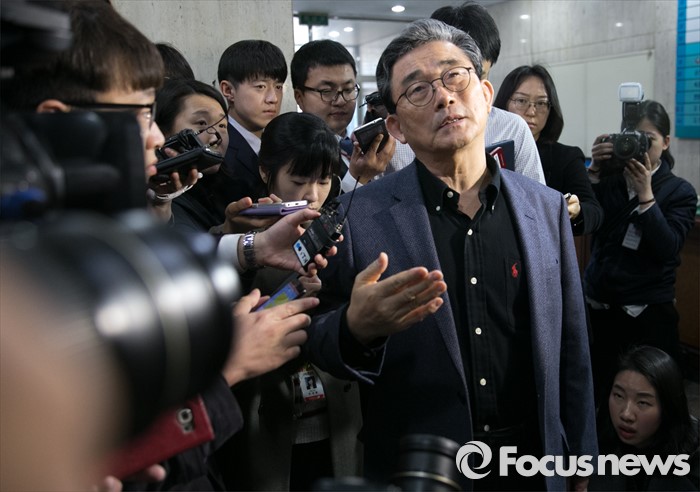 (서울=포커스뉴스) 김무성 새누리당 대표가 당 공천관리위원회의 결정에 반발해 유승민 의원 등 지역구 6곳에 대해 무공천을 선언해 갈등이 이어지고 있는 25일 오전 서울 여의도 당사로 이한구 공천관리위원장이 출근하며 취재진 질문에 답하고 있다.