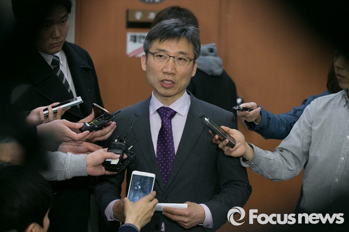 (서울=포커스뉴스) 이상규 전 통합진보당 의원이 25일 오전 서울 여의도 국회 정론관에서 기자회견을 마친 뒤, 기자들의 질문에 답변하고 있다. 지난 2014년 12월 헌법재판소의 통진당 해산결정으로 국회의원직을 박탈당한 이 전 의원은 민중연합당에 입당해, 이번 20대 총선에서 서울 관악을에 출마한다고 밝혔다.