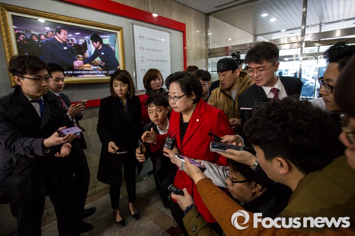 (서울=포커스뉴스) 이른바 진박 후보 공천장에 도장 못찍는다며 김무성 새누리당 대표의 '옥새투쟁'이 이어지고 있는 25일 오전 서울 영등포구 새누리당사 앞에서 김을동 새누리당 최고위원이 회의에 참석하기 위해 이동 하고 있다.