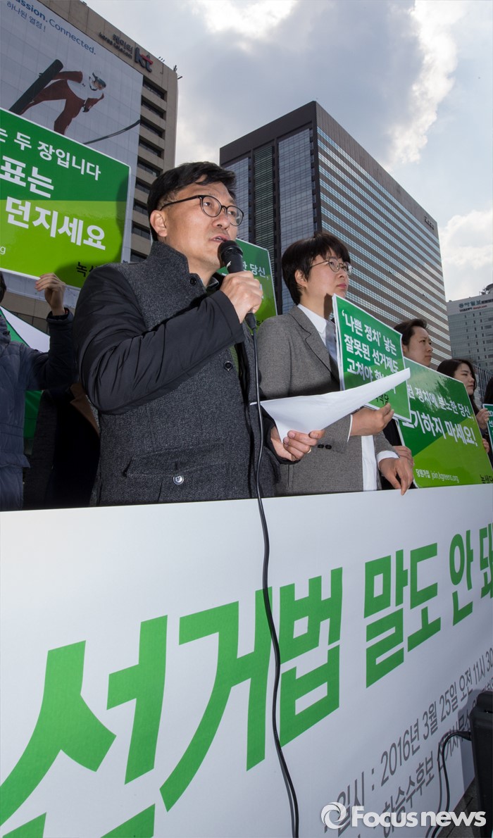 (서울=포커스뉴스) 25일 오전 서울 광화문광장에 마련된 녹색당 천막 선거사무소 앞에서 열린 선거제도 전면 개혁 요구 기자회견에 참석한 하승수 공동운영위원장이 기존 선거제도의 문제점에 대해 설명하고 있다.