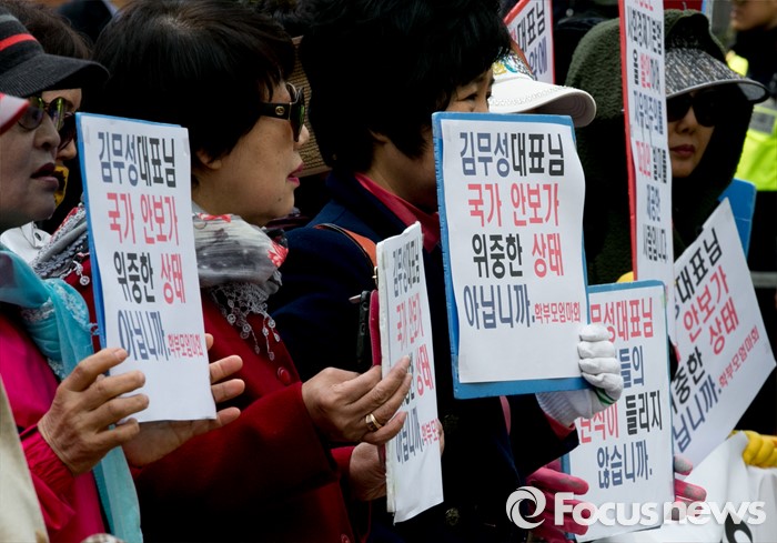 (서울=포커스뉴스) 김무성 새누리당 대표가 당 공천관리위원회의 결정에 반발해 유승민 의원 등 지역구 6곳에 대해 무공천을 선언해 갈등이 이어지고 있는 25일 오후 서울 여의도 당사 앞에서 김 대표의 결정에 반대하는 시민단체들이 집회를 하고 있다.