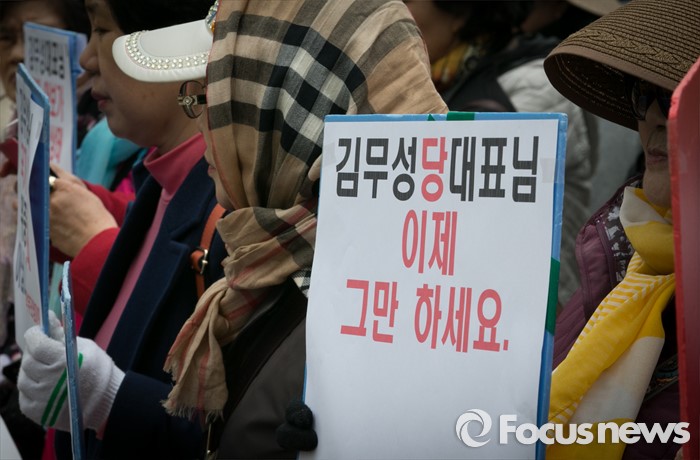 (서울=포커스뉴스) 김무성 새누리당 대표가 당 공천관리위원회의 결정에 반발해 유승민 의원 등 지역구 6곳에 대해 무공천을 선언해 갈등이 이어지고 있는 25일 오후 서울 여의도 당사 앞에서 김 대표의 결정에 반대하는 시민단체들이 집회를 하고 있다.