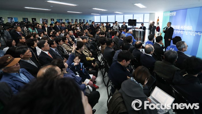 (용인=포커스뉴스) 김종인 더불어민주당 비대위 대표가 25일 오후 경기도 용인시 표창원 후보 선거사무소 개소식에 참석해 축사 하고 있다.