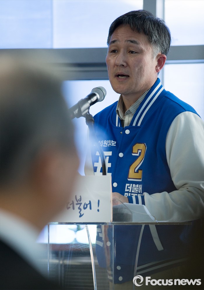 (용인=포커스뉴스) 표창원 더불어민주당 경기 용인정 후보가 25일 오후 경기도 용인시 선거사무소 개소식에 참석해 내빈들에게 인사말을 하고 있다.