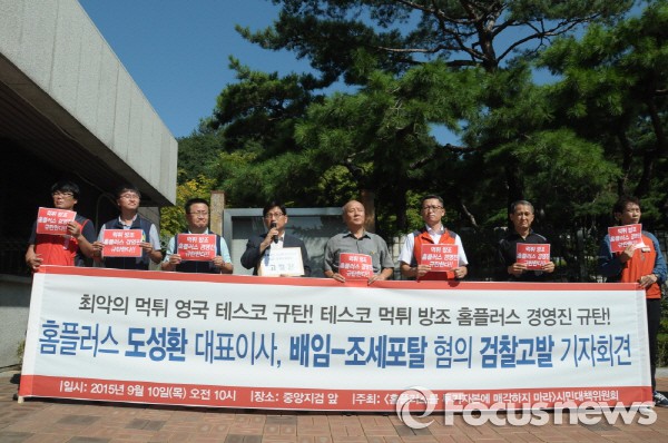 노조는 영국 테스코가 지난해 말 홈플러스를 7조2000억원에 매각하면서 4조7000억원의 매각차익을 실현한 이후 매각에 따른 양도차익에 대한 과세가 공정하게 이뤄졌는지에 대해 국세청에 ‘테스코의 세금납부 정보공개’ 요청을 할 계획이다.홈플러스 매각 반대 시민대책위가 2015년 9월10일 서울중앙지검 앞에서 홈플러스 도성환 대표에 대한 배임-조세포탈 혐의 검찰 고발 기자회견을 하고 있다.<사진제공=홈플러스 노조>