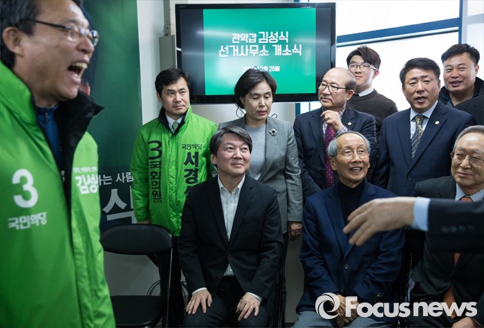 (서울=포커스뉴스) 안철수 국민의당 상임공동대표(가운데)가 25일 오후 서울 관악구 김성식 후보 선거사무소 개소식에서 윤여준 전 환경부장관과 나란히 앉아 있다. 왼쪽부터 김성식 후보, 안 대표, 윤 전 장관