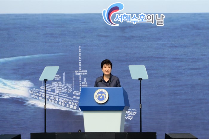 (대전=포커스뉴스) 박근혜 대통령이 25일 오전 대전 유성구 국립대전현충원에서 열린 제1회 서해수호의 날 기념식에 참석해 기념사를 하고 있다. <사진제공=국립대전현충원>