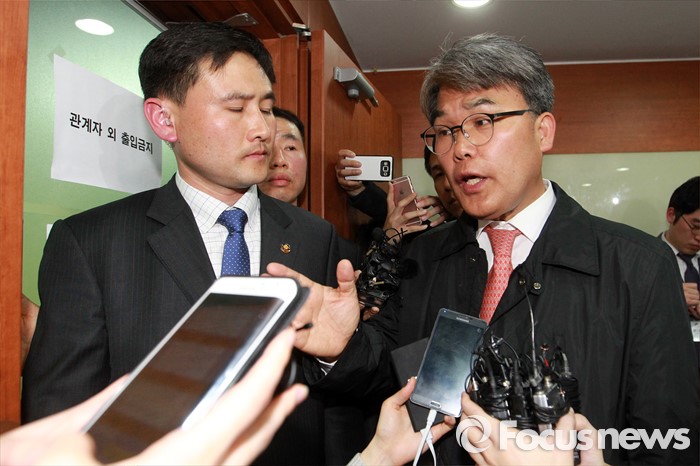 (서울=포커스뉴스) 이재만(오른쪽) 새누리당 대구 동을 예비후보가 25일 오후 서울 여의도 당사 회의장 입구에서 최고위원회의 무공천 결정에 대해 항의하며 면담을 요청하고 있다. 이날 새누리당 최고위는 정종섭(대구 동갑), 추경호(대구 달성), 이인선(대구 수성을) 후보의 공천을 확정했으며, 유영하(서울 송파을), 이재만(대구 동을), 유재길(서울 은평을) 후보는 공천 의결 보류를 확정했다.