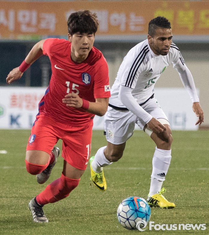 (이천=포커스뉴스) 25일 오후 경기 이천종합운동장에서 열린 KEB하나은행 초청 올림픽대표 대한민국과 알제리의 친선경기에서 전반전 한국 박인혁이 드리블을 하고 있다.