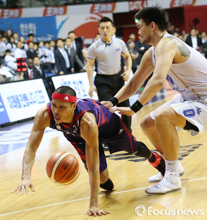 (고양=포커스뉴스) 25일 고양체육관에서 열린 2015-2016 프로농구 챔피언결정전 4차전 오리온-KCC경기에서 공격하던 오리온 문태종이 KCC 하승진에게 걸려 넘어지고 있다. 하승진은 5반칙으로 퇴장.