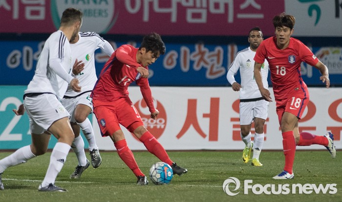 (이천=포커스뉴스) 25일 오후 경기 이천종합운동장에서 열린 KEB하나은행 초청 올림픽대표 대한민국과 알제리의 친선경기에서 후반전 한국 최경록이 패스를 하고 있다.