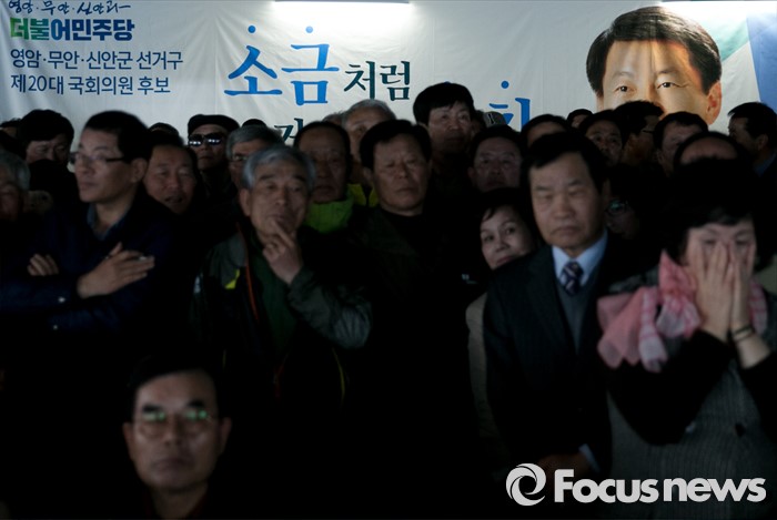 (무안=포커스뉴스) 26일 오후 전남 무안군에서 열린 서삼석 더불어민주당 전남 영암·무안·신안군 후보 선거사무소 개소식에 참석한 시민들이 김종인 비대위 대표의 축사를 듣고 있다.