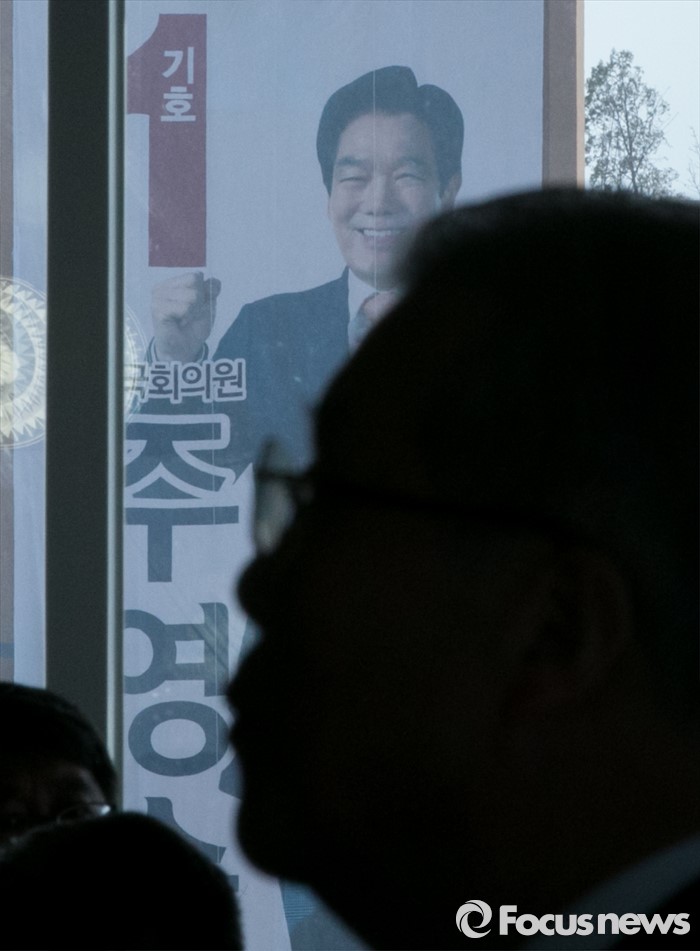 (무안=포커스뉴스) 26일 오후 전남 무안군에서 열린 서삼석 더불어민주당 전남 영암·무안·신안군 후보 선거사무소 개소식에 참석한 김종인 비대위 대표가 축사를 하고 있는 모습 너머로 상대 후보인 주영순 새누리당 의원 선거사무소가 보이고 있다.