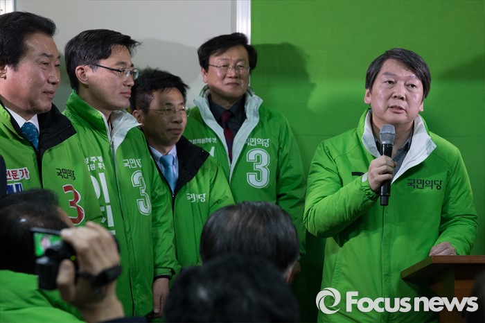 (서울=포커스뉴스) 안철수(오른쪽) 국민의당 상임공동대표가 26일 오후 서울 노원구 노원병 선거사무소 개소식에서 인사말을 하고 있다.