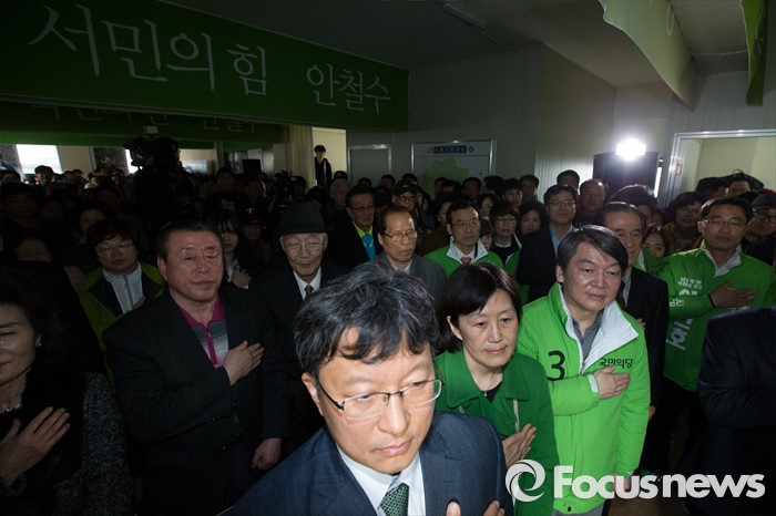 (서울=포커스뉴스) 안철수 국민의당 상임공동대표가 26일 오후 서울 노원구 노원병 선거사무소 개소식에 참석해 국민의례를 하고 있다.
