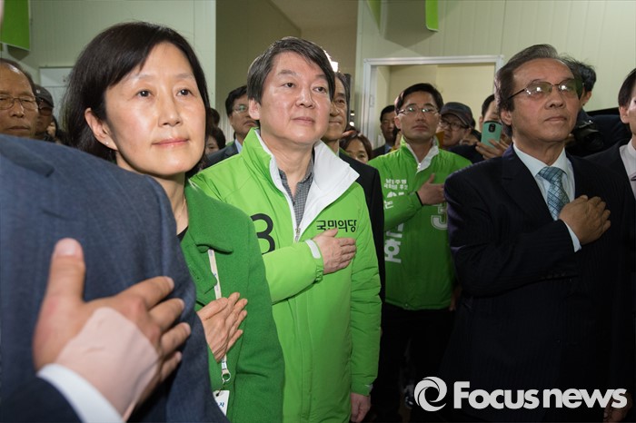 (서울=포커스뉴스) 안철수 국민의당 상임공동대표가 26일 오후 서울 노원구 노원병 선거사무소 개소식에 참석해 국민의례를 하고 있다.