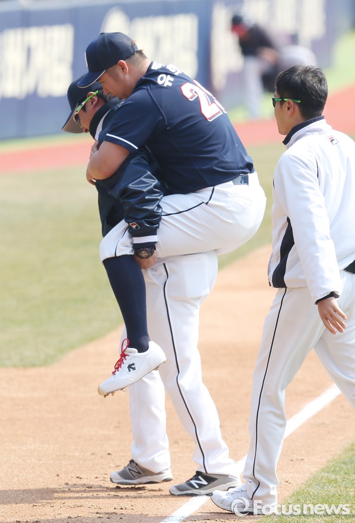 | △ 업혀 나가는 유희관 |