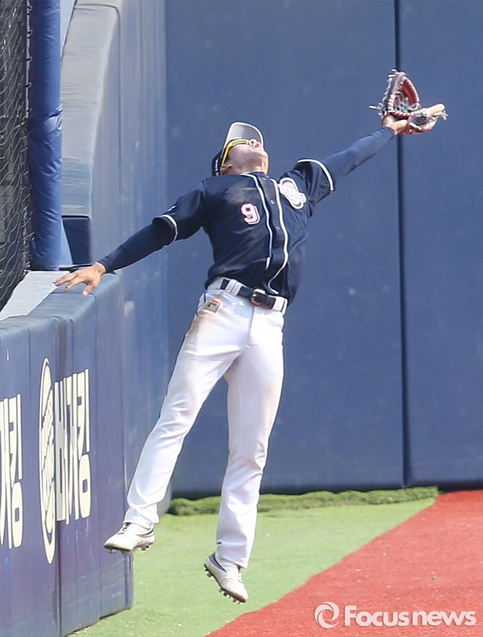 (서울=포커스뉴스) 27일 서울 잠실구장에서 열린 2016프로야구 시범경기 두산-LG 경기에서 8회말 두산 좌익수 조수행이 LG 이병규의 파울플라이를 펜스에 붙어서 잡아내고 있다.