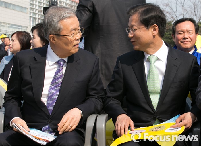 (광주=포커스뉴스) 김종인(왼쪽) 더불어민주당 비대위 대표, 천정배 국민의당 공동대표가 27일 오후 광주광역시청 문화광장에서 열린 2016 부활절 연합예배에 참석해 대화하고 있다.