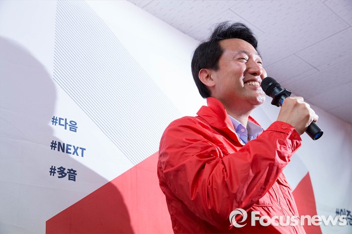 (서울=포커스뉴스) 27일 오후 서울 노원구 이준석 선거사무소 개소식에 참석한 오세훈 새누리당 서울 종로 후보가 축사를 하고 있다.