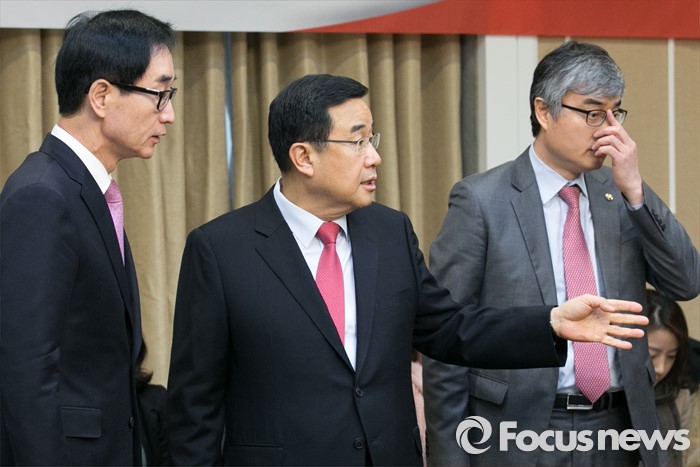 (서울=포커스뉴스) 김정훈(가운데) 새누리당 정책위의장과 이준식(왼쪽) 사회부총리 겸 교육부 장관, 이영 교육부 차관이 28일 오전 서울 여의도 국회에서 열린 누리과정 등 교육현안 관련 당정협의에 참석해 대화하고 있다.