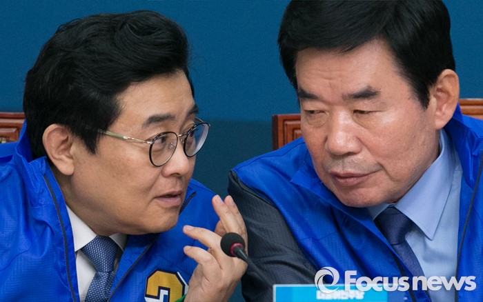(서울=포커스뉴스) 김진표(오른쪽), 전병헌 더불어민주당 선대위 부위원장이 27일 오전 서울 여의도 국회에서 중앙선거대책위원장단회의에 참석하고 있다.
