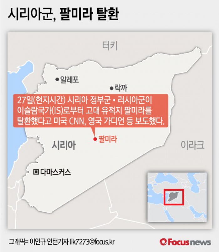 (서울=포커스뉴스) 27일(현지시간) 시리아 정부군, 러시아군이 이슬람국가(IS)로부터 고대 유적지 팔미라를 탈환했다고 미국CNN, 영국 가디언 등이 보도했다.