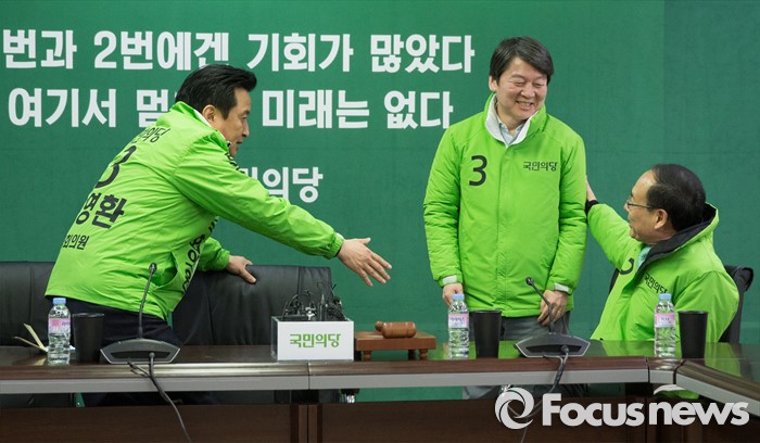 (서울=포커스뉴스) 안철수 국민의당 대표(가운데)와 오세정 공동선거대책위원장이 28일 서울 마포구 당사에서 열린 선거대책위원회의에서 서로 자리를 양보하고 있다.