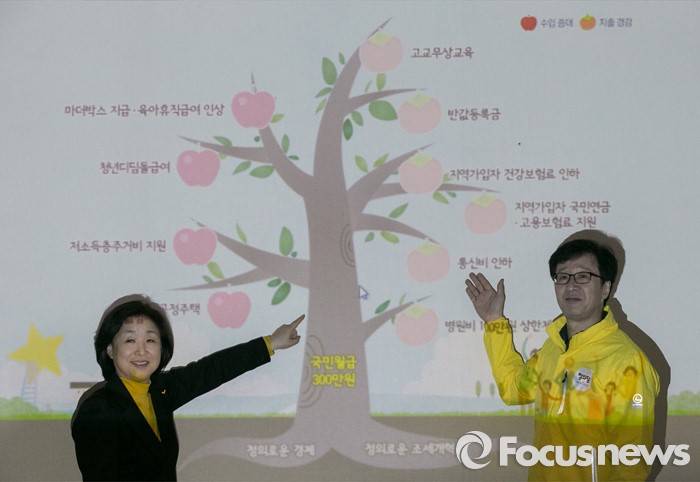 (서울=포커스뉴스) 심상정(왼쪽) 정의당 상임선대위원장과 천호선 공동선대위원장이 28일 오전 서울 여의도 국회에서 열린 중앙선대위 회의에 참석해 '정의로운 가계부' 소개 및 시연 행사 후 취재진을 향해 포즈를 취하고 있다.