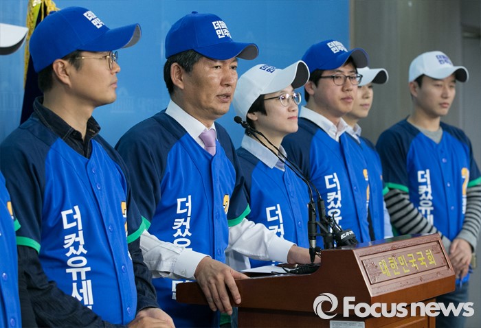 (서울=포커스뉴스) 더불어민주당에서 공천 탈락한 정청래, 김광진, 장하나 의원과 김빈 청년 비례대표 후보, 이동학 예비후보 등으로 구성된 '더컸유세단'이 28일 오전 서울 여의도 국회 정론관에서 출범 기자회견을 하고 있다.