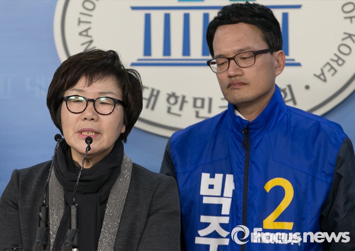 (서울=포커스뉴스) 20대 총선 서울 은평갑 선거구에서 공천 탈락한 이미경(왼쪽) 더불어민주당 의원이 28일 오전 서울 여의도 국회 정론관에서 열린 박주민 은평갑 후보 출마 기자회견에 참석해 지지 발언을 하고 있다.