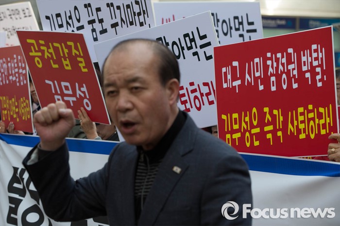 (서울=포커스뉴스) 28일 오후 서울 영등포구 새누리당 당사 앞에서 대구 동구을 무공천 발표로 총선 출마가 좌절된 이재만 전 대구 동구청장의 지지자들이 김무성 새누리당 대표의 사퇴를 촉구하고 있다.