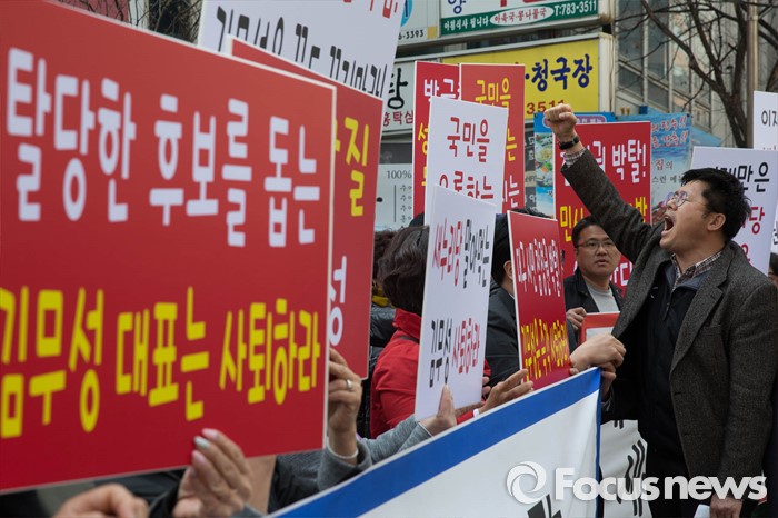 (서울=포커스뉴스) 28일 오후 서울 영등포구 새누리당 당사 앞에서 대구 동구을 무공천 발표로 총선 출마가 좌절된 이재만 전 대구 동구청장의 지지자들이 김무성 새누리당 대표의 사퇴를 촉구하고 있다.