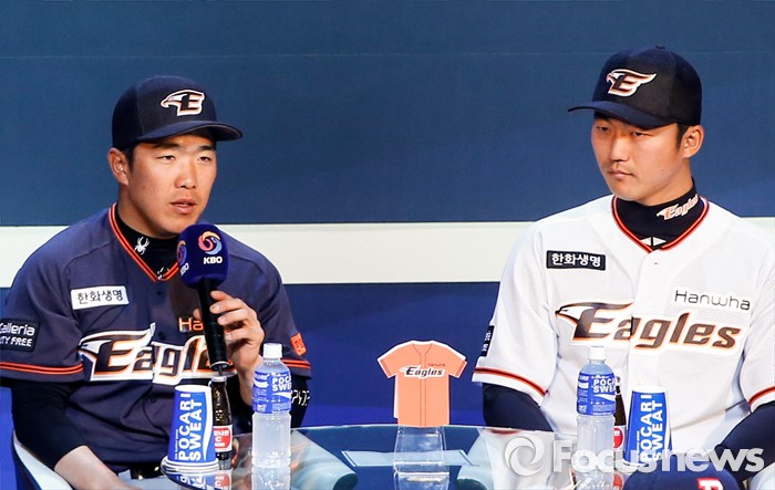 (서울=포커스뉴스) 28일 오후 서울 용산구 브루스퀘어 삼성카드홀에서 열린 '2016 타이어뱅크 프로야구 미디어데이 & 팬페스트' 행사에 참석한 한화 이글스 정근우 선수가 새 시즌에 임하는 각오를 밝히고 있다.