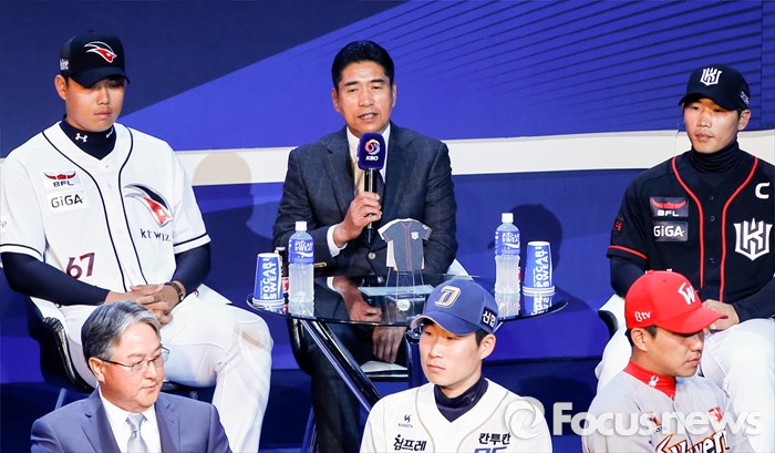 (서울=포커스뉴스) 28일 오후 서울 용산구 브루스퀘어 삼성카드홀에서 열린 '2016 타이어뱅크 프로야구 미디어데이 & 팬페스트' 행사에 참석한 kt 위즈 조범현 감독이 새 시즌 출사표를 밝히고 있다.