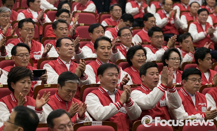 (서울=포커스뉴스) 28일 오후 서울 여의도 국회 의원회관에서 열린 새누리당 20대 총선 공천자대회에 참석한 후보들이 김무성 공동선대위원장의 발언을 듣고 박수치고 있다.