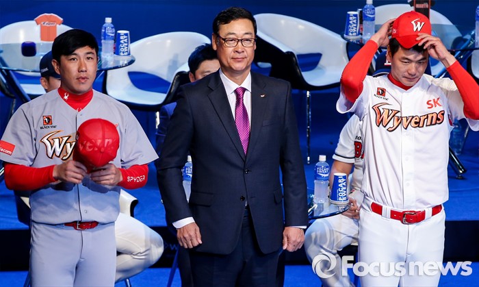 (서울=포커스뉴스) 28일 오후 서울 용산구 브루스퀘어 삼성카드홀에서 열린 '2016 타이어뱅크 프로야구 미디어데이 & 팬페스트' 행사에 참석한 SK 와이번스 김용희 감독(가운데)과 김강민, 김광현이 포즈를 취하고 있다.