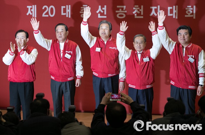 (서울=포커스뉴스) 28일 오후 서울 여의도 국회 의원회관에서 열린 새누리당 20대 총선 공천자대회에 참석한 공동선대위원장들이 인사하고 있다. 왼쪽부터 이인제, 서청원, 김무성, 강봉균, 원유철 위원장.